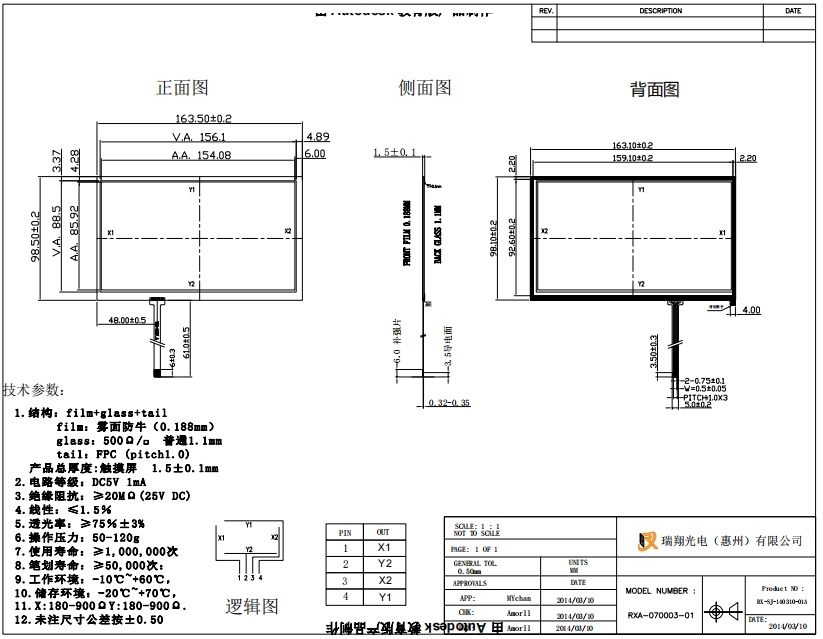 7 インチ 4 線式抵抗膜式タッチ スクリーンの図面 :