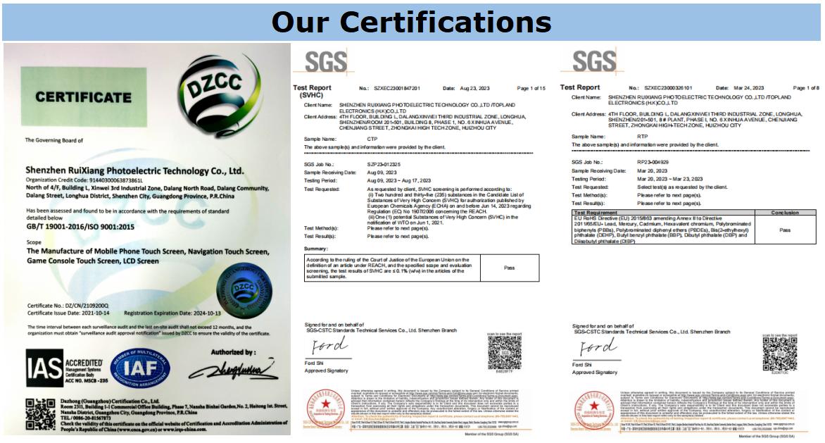 PCAP タッチ スクリーンおよび抵抗膜式タッチ スクリーンの証明書: